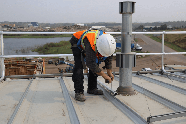 This municipal waste facility turns garbage into compost material and ethanol. They had to install high pressure gas piping on the roof of their facility to allow connection to a material dryer system. They hired MI Safety to rent and install some standing seam roof fall arrest anchors and some guardrails. Upon completion of the project we removed the equipment from site.
