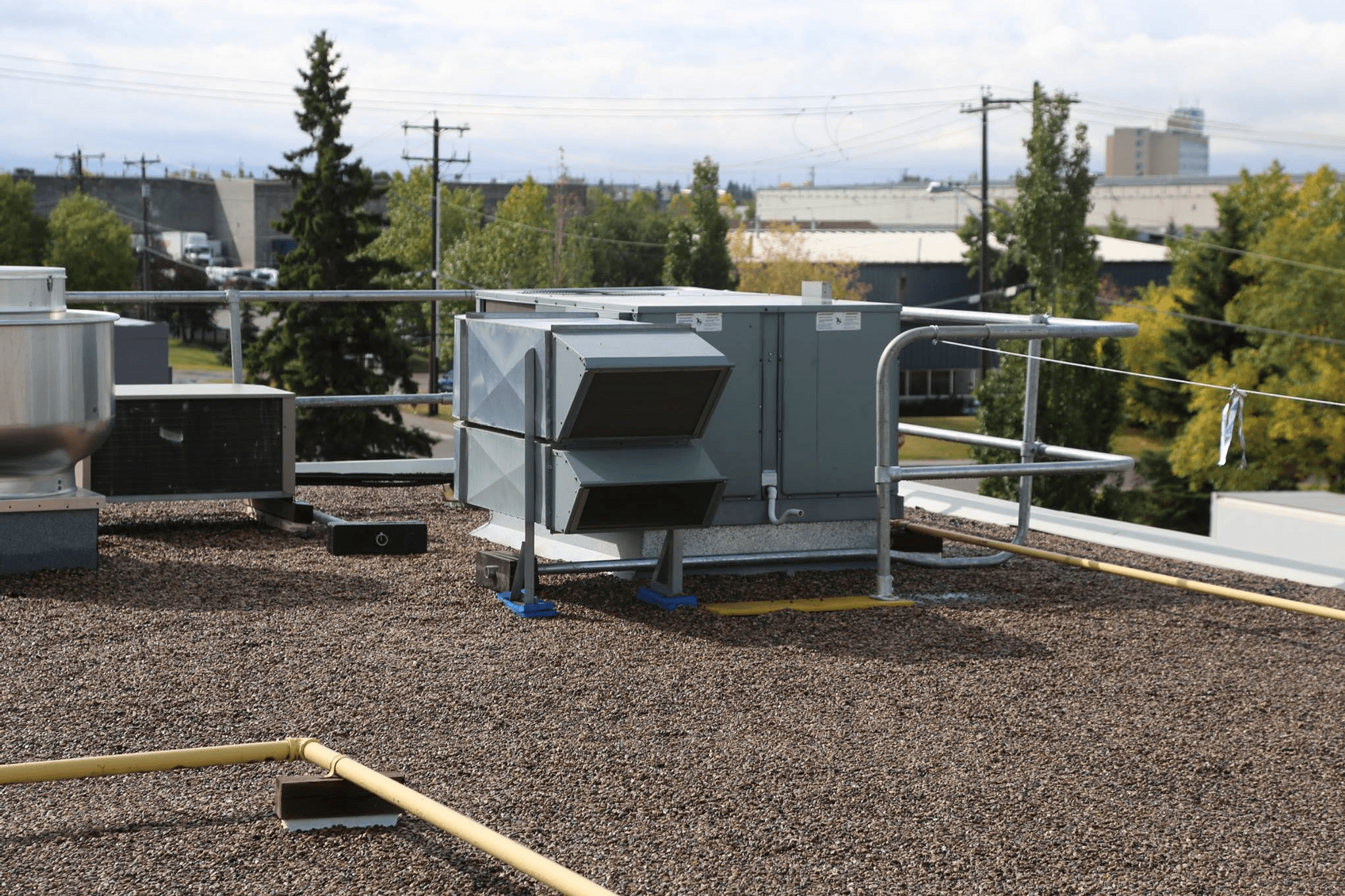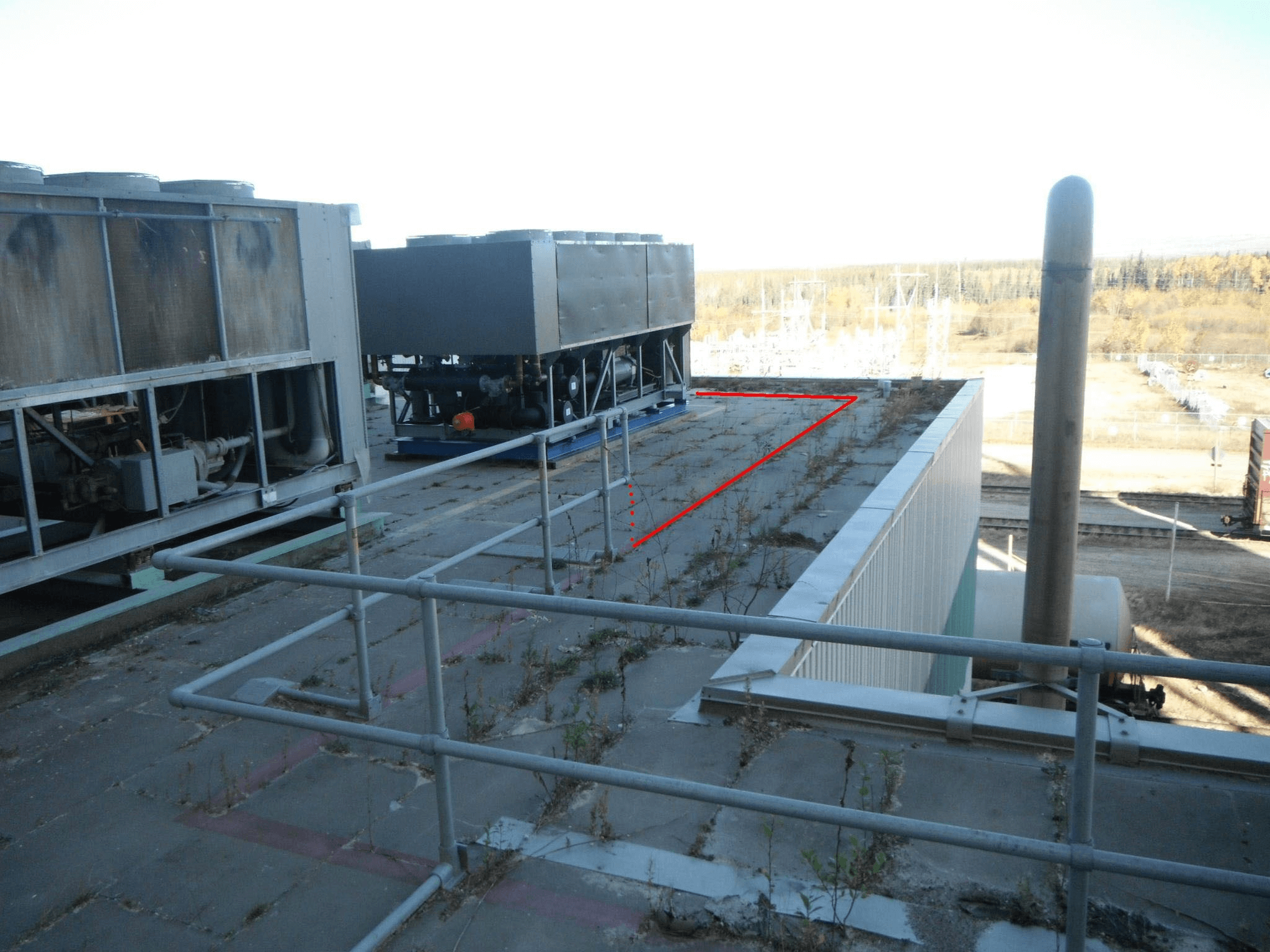 This laboratory facility has a large office complex with an extensive array of hvac and roof top vents and data communication equipment on it. They needed a quick solution that didn't penetrate the roof to protect workers completing HVAC work. MI Safety Inc was able to design, and install a guardrail and control zone system to protect the common work areas.