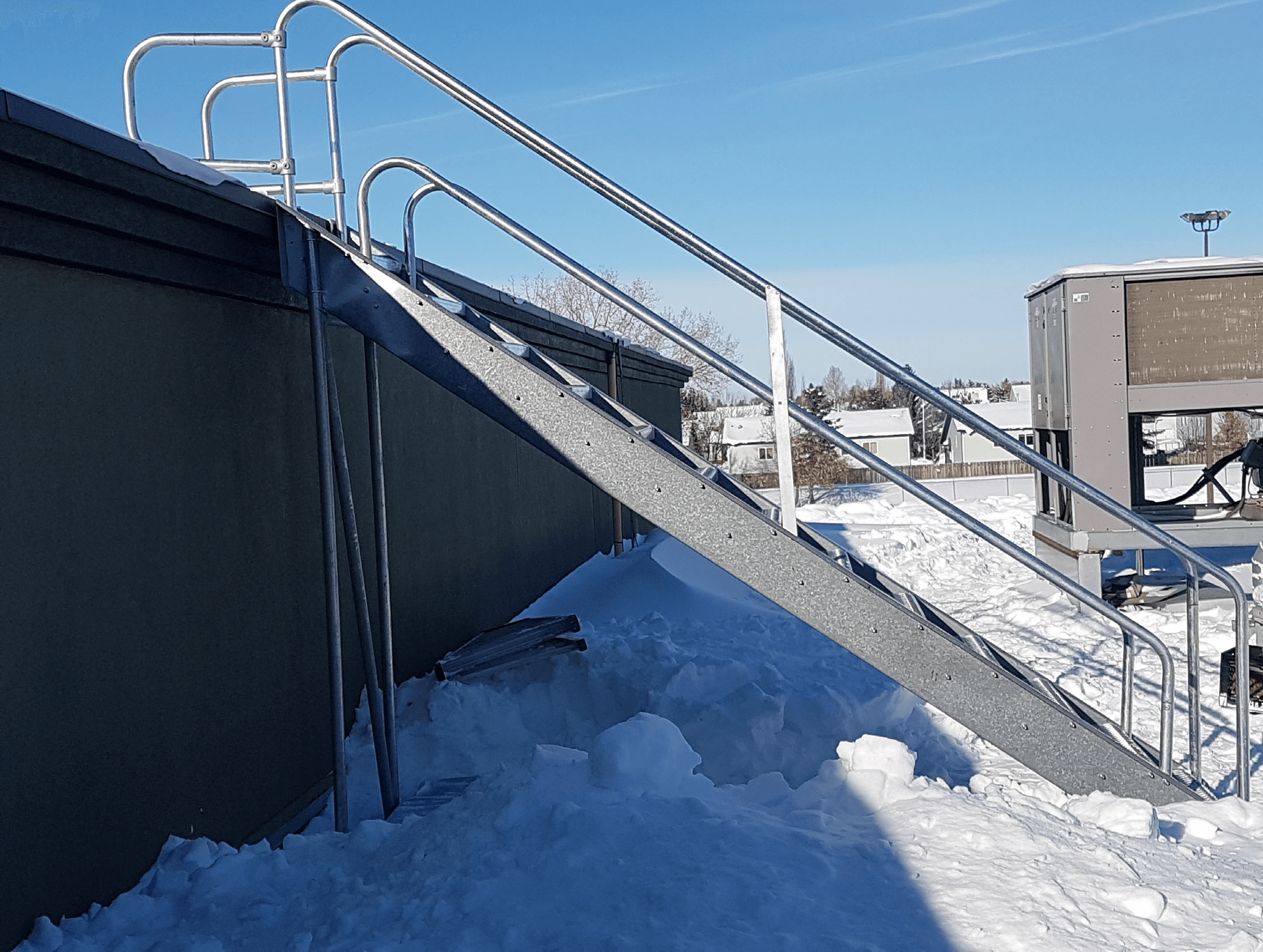 Commercial Building Operator needed a retrofit of a staircase access on their building to replace a ladder that was deemed unsafe for access. It was not feasible to build the staircase in a shop and lift it onto the roof, so we constructed a modular staircase that we assembled on the roof.