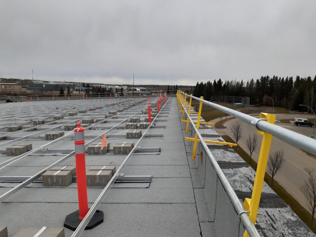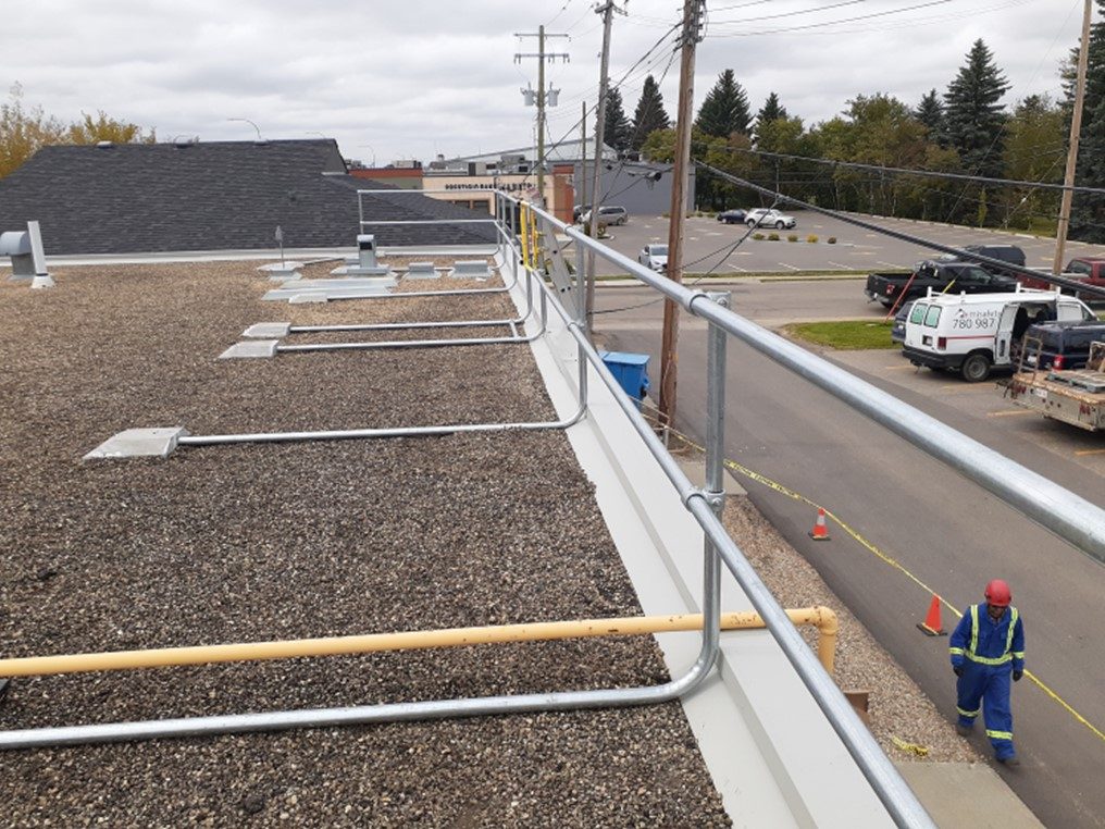 This northern Alberta Camp Operator wanted to install a guardrail as per section 139 of the Alberta OHS code to protection workers accessing this work area on a regular basis. MI Safety designed and installed a guardrail system that attached to the wall as roof attachment was not an option.
