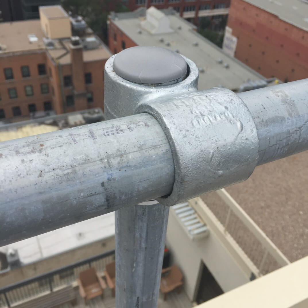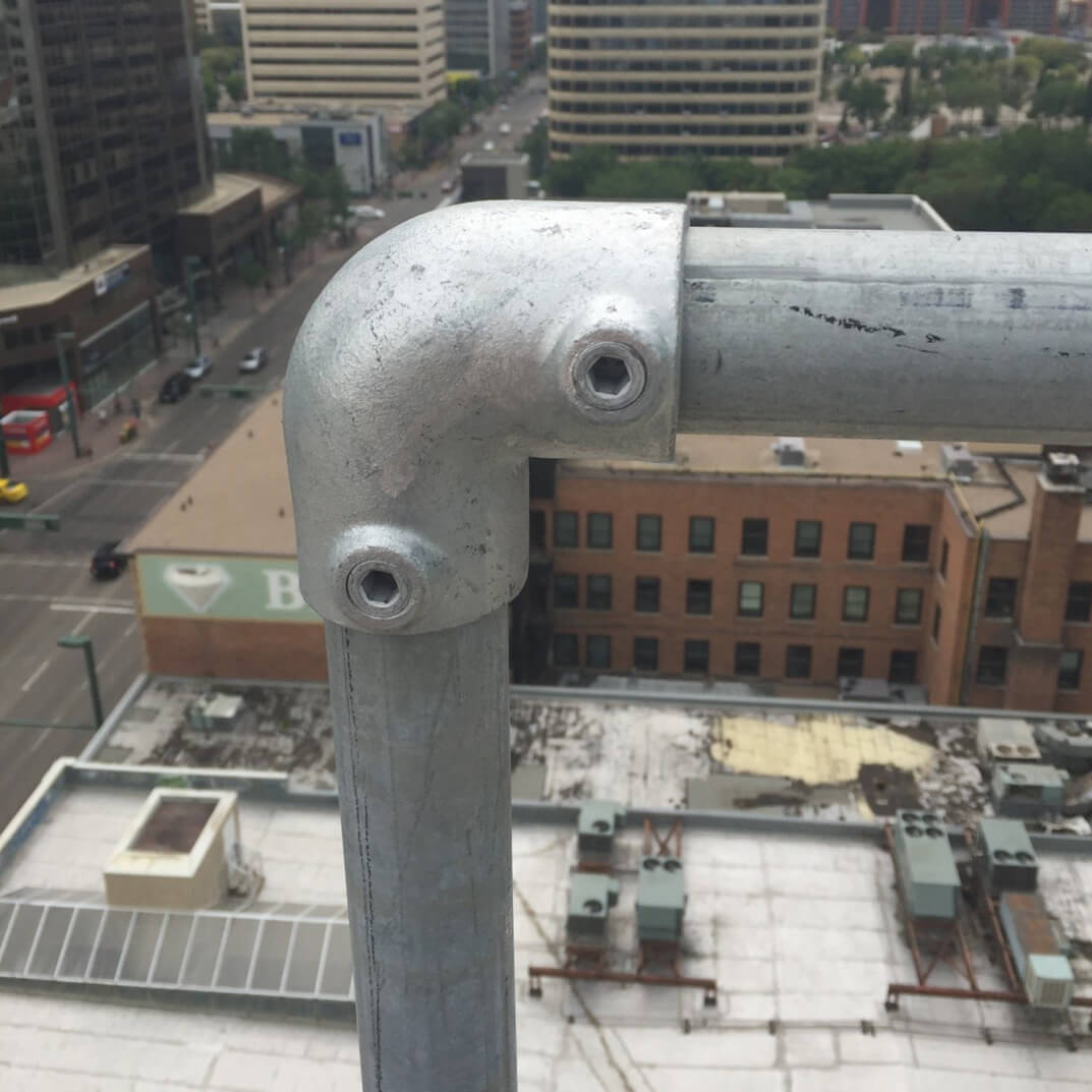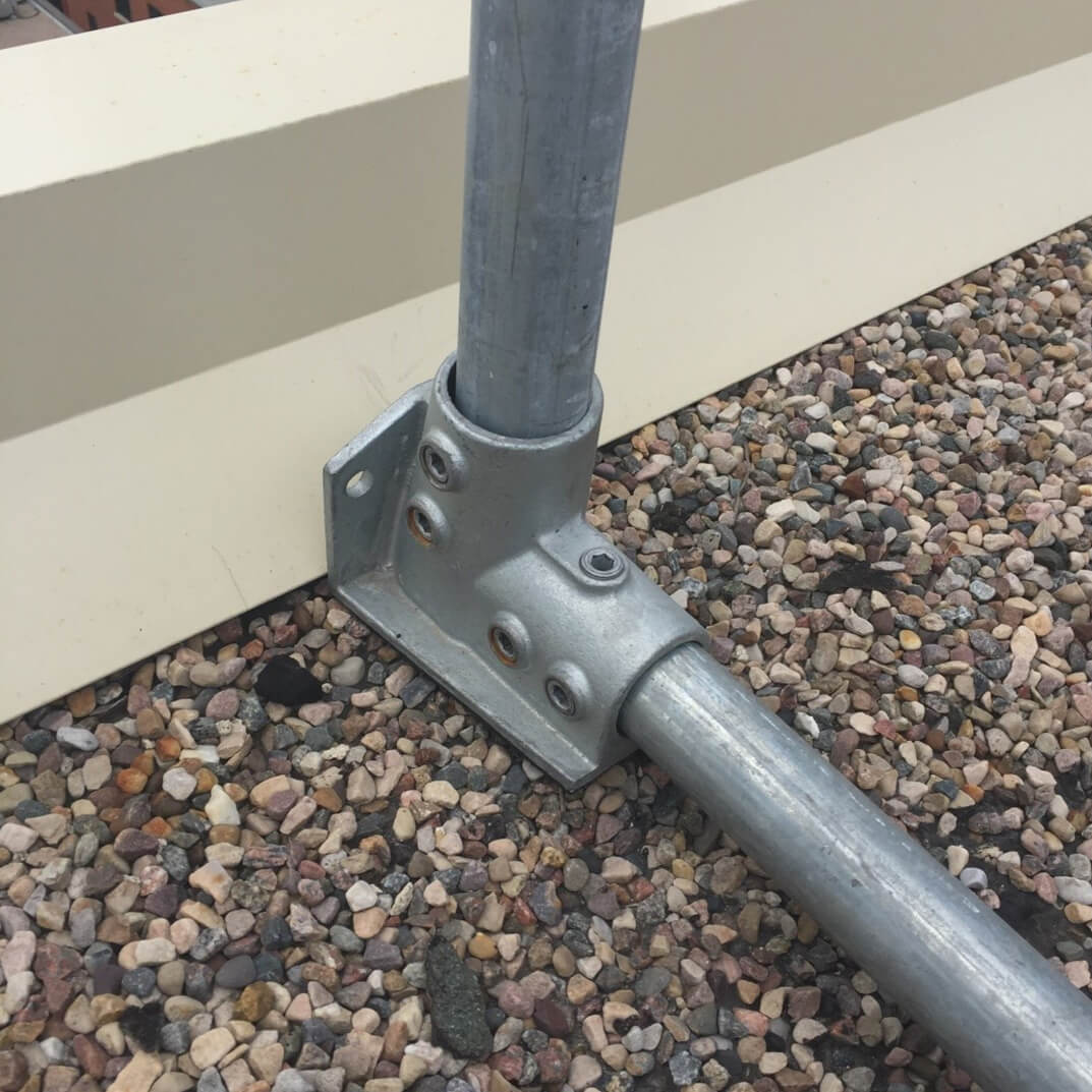 The Capital Safety system consists of a weight plate that is placed on the roof and then a prefabricated handrail system is inserted into pockets in the weight plate. The Capital Safety Guardrail is very similar to the Safety Rail 2000 System. The second style is the Kee Guard System. This consists of cantilevered counter weights, attached to vertical posts and horizontal rails. They are connected with a friction connection and use 90 degree connectors, single socket tee’s, base flanges, and are held securely together with Allan Bolt connectors.