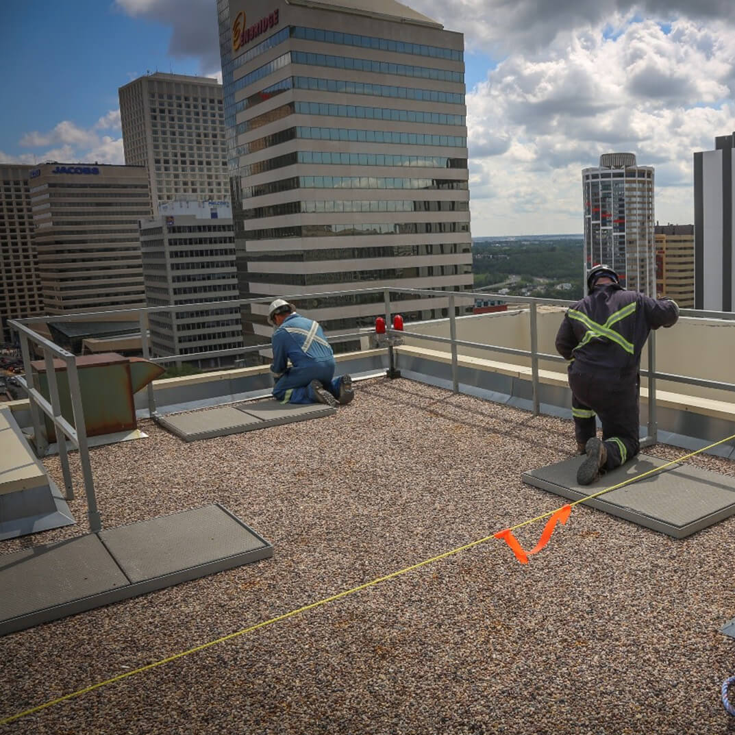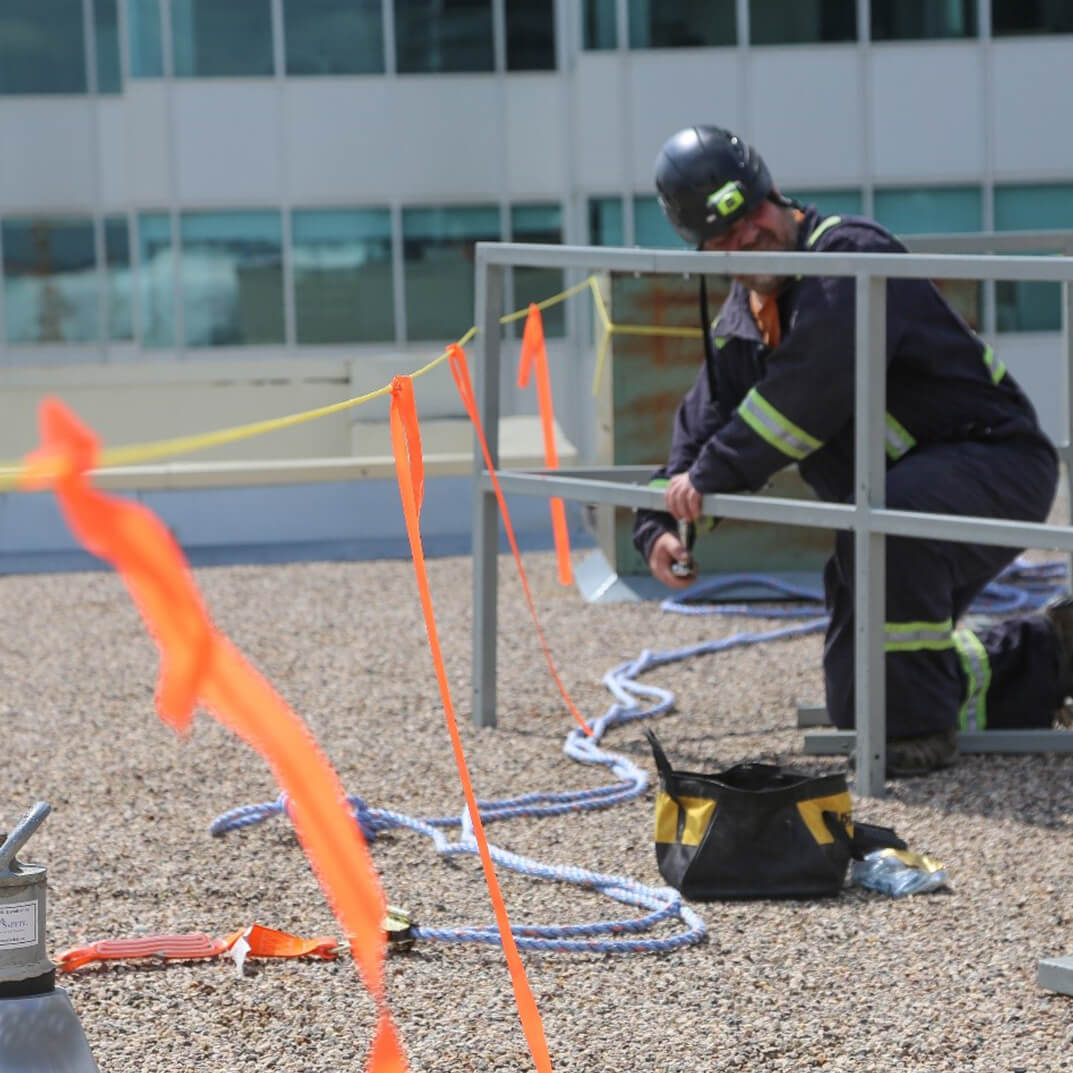 Work completed within 2 meters or 6.6 feet of an edge requires a guardrail or a fall protection system. Guardrails are the most reliable solution. Although they have the greatest upfront cost, the long term cost is the lowest. The work location of many roofs is often more than 2m/ 6.6’ from an edge and as such a control zone is the most cost effective solution to protect the roof.
